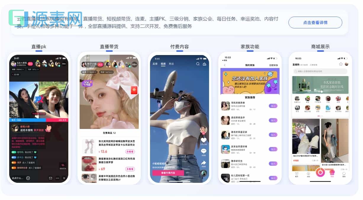 - 电商直播:支持直播带货、商品展示、实时互动下单等功能。