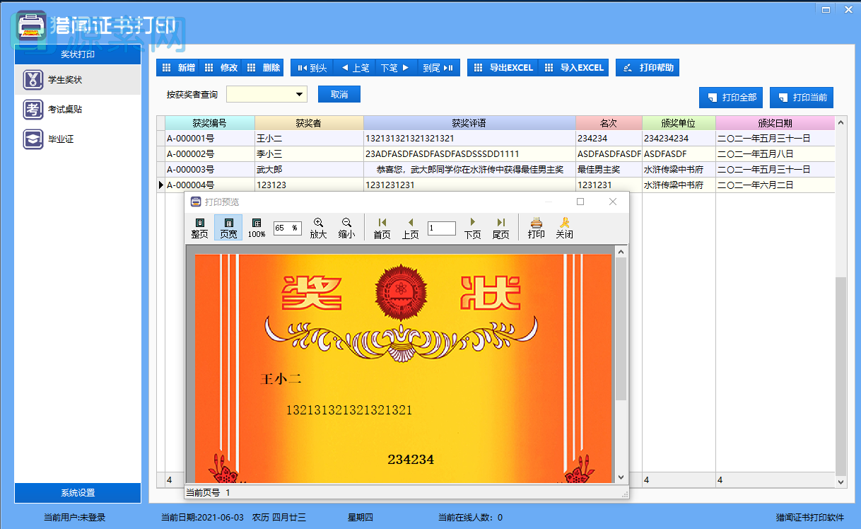 如未配置PDF导出的文件在奖状显示完全的情况下 右边和下边会有空白区,这是因为你没有设置打印机打印规格大小所导致,和软件没有关系!