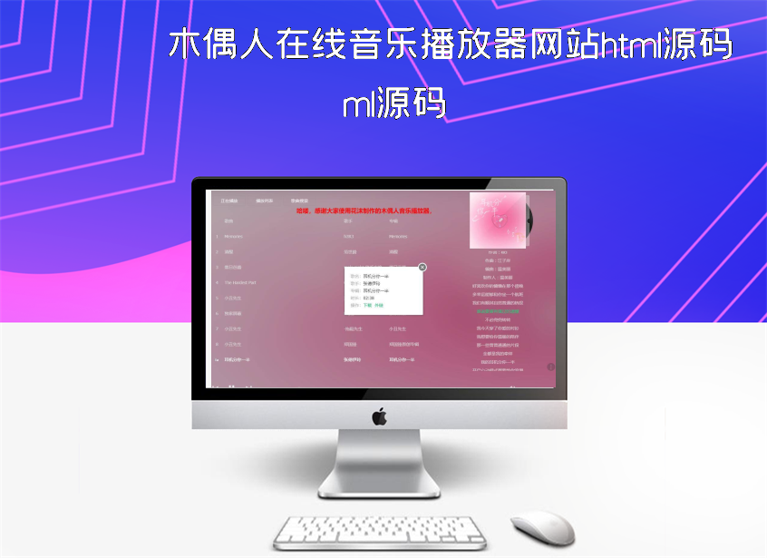 木偶人音乐播放器是一款开源的基于 Meting 的在线音乐播放器。具有音乐搜索、播放、下载、歌词同步显示、个人网易云音乐播放列表同步等功能。前端界面参照 QQ 音乐网页版进行布局,同时采用了流行的响应式设计,无论是在PC端还是在手机端,均能给您带来原生 app 般的使用体验,运行环境:PHP5.4+。