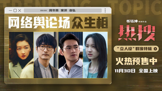 1905电影网讯 由忻钰坤执导,周冬雨、宋洋、袁弘领衔主演的电影《热搜》将于11月30日全国上映,打响贺岁第一枪。电影发布“立人设”群像特辑,导演忻钰坤坦言“《热搜》剧本中新鲜且有力量的一个设置就是人物”。有瑕疵的施救者、沉默的围观者、无下限的施暴者和不完美的受害者,共同上演了一场“硝烟四起”的网络舆论战。弱者与强权搏命对抗,冷漠麻木的看客在旁围观,这场为真相发声的正义之战会如何展开,令人期待。