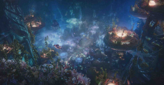 穿过这篇“黑暗丛林”后,就可以看到位于火山岛中心的黑蝠鲼老巢,这里也是亚瑟和奥姆第一次与黑蝠鲼交手的地方。美术部门花费数周努力,为布景搭建了岩石表面,让嵌在岩石内的楼梯通向一处守望台式的控制中心。布景中还四处摆放着一箱箱从失落王国打捞起的武器、盔甲和其他宝贝。正是因为幕后团队对细节的极致追求,才让温子仁导演无与伦比的想象力得以在现实中呈现,才能为观众们打造出这场前所未见的视觉盛宴。