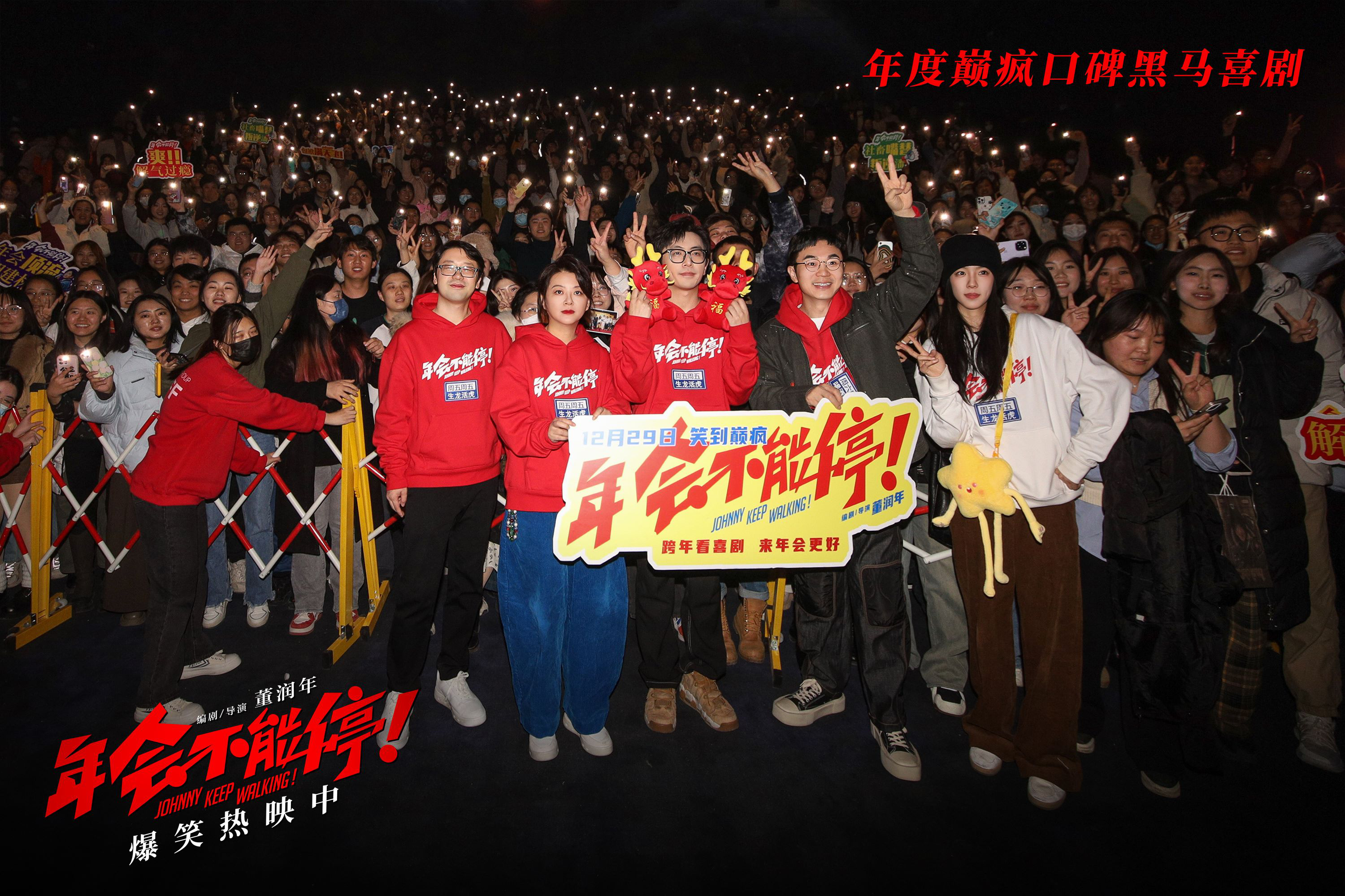 主创们在路演现场收到不少颇具当地特色的美食,包括观众特别提醒“要跟电影中的上班族一样得卷着吃”的山东卷饼,送给山东人白客的代表家乡味的大葱,还有观众给全体主创准备了济南特产绿豆糕,并表示其中暗含谐音梗,庄达菲机智解读“《年会不能停!》上座率都高(绿豆糕)”,美好寓意让主创颇为感动,也向观众送上“2024年背锅加班不能有,升职加薪不能停”的新年祝福。影片正在好评热映中,相信必定会让观众欢乐跨年笑到上头。