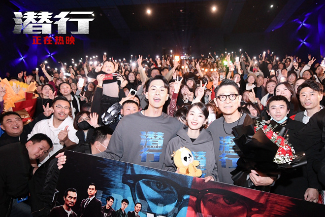 12月31日,《潜行》全国路演来到成都,影片监制兼主演刘德华携总制片人李亚平、演员刘雅瑟、朱鉴然现身映后互动,陪伴观众们渡过2023年的最后一天。主创们现场跟成都观众学习方言,并用四川话为大家送上新年祝福。刘德华现场也惊喜收获了影迷们用1200张票根拼成的林阵安造型的海报及全场400多人的大合唱,气氛温暖而感动。一位来自重庆的警察在观影后感触颇深,他从自身从警经历出发,表示对电影中三代警察为缉毒所付出的努力和艰辛深有共鸣,并称赞影片“为社会敲响了警钟”。