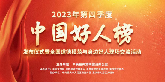 1905电影网讯 2024年1月31日,2023年第四季度“中国好人榜”发布仪式暨全国道德模范与身边好人现场交流活动,将在重庆市大足区举办。本次发布活动将对大足石刻这一世界文化遗产的保护传承,与中国好人榜评选与发布相融合,由沈铁梅、王仁君、黄品沅、鄂靖文、刘昊宇等文艺工作者担任“中国好人”推荐人,在推荐本季度好人之外,更特别设置年度致敬环节,集中回顾2023年度606名“中国好人”,在收官之际重磅传递“好人来自于好人,好人传播于好人”的时代力量。