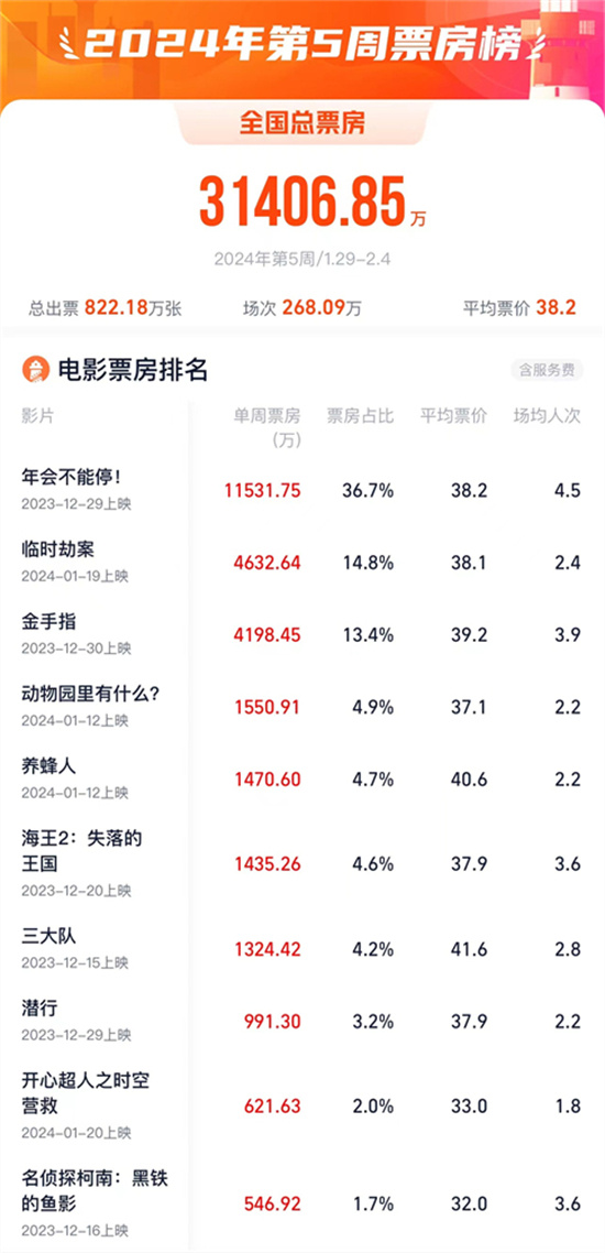当中,《年会不能停!》贡献票房超1.1亿,这也是该片连续第五周拿下周榜头名。排名次席和第三位的同样是老朋友:《临时劫案》《金手指》两部影片单周票房也在4000万以上。第四、五名的《动物园里有什么?》和《养蜂人》则均在本周实现了票房过亿。