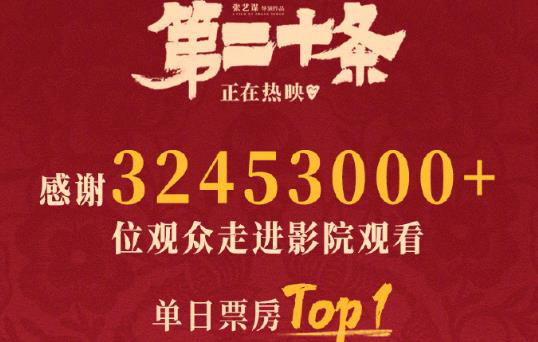 《第二十条》首夺单日票房冠军 总票房突破15.6亿 娱乐 2月20日 小编国际资源网 取消关注 关注 私信 1905电影网讯 据灯塔专业版数据显示,截至2月19日21时30分,春节档电影《第二十条》单日票房达9502.75万,自上映以来首次成为单日票房冠军。本片当前总票房已突破15.6亿。 《第二十条》由张艺谋执导,集结范伟、雷佳音、马丽,赵丽颖、刘耀文等老中青三代演员,讲述一个基层挂职的“小”检察官面临三起涉及正当防卫案件的“普法”故事。