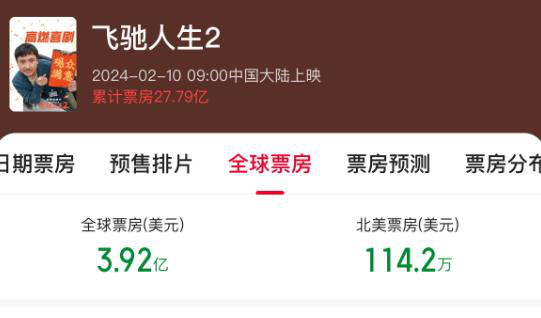 电影《飞驰人生2》北美热映 总票房超114万美元 娱乐 2月22日 小编国际资源网 取消关注 关注 私信 1905电影网讯 据猫眼专业版数据显示,电影《飞驰人生2》于2月10日在北美上映,截至发稿,影片北美总票房已超114.2万美元,全球总票房达3.92亿美元。 《飞驰人生2》是2019年上映电影《飞驰人生》的续作,依旧是一部赛车题材作品,也是一个关于梦想、坚持与自我超越的故事。影片讲述赛车手张弛(沈腾 饰)再次组建车队,与厉小海(范丞丞饰)、孙宇强(尹正饰)、记星(张本煜饰)、刘显德(孙艺洲饰)冲刺最后一届巴音布鲁克拉力赛。