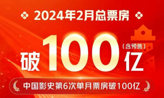 1905电影网讯 据灯塔专业版数据显示,截至2月23日10时27分,中国电影2024年2月总票房(含预售)突破100亿元,总出票2.09亿张,场次达1025.65万,这也是中国影史第六次单月票房破100亿大关。