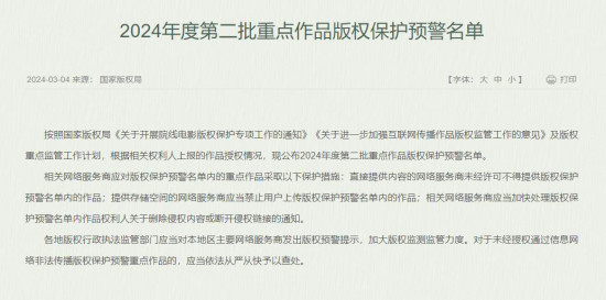 1905电影网讯 近日,国家版权局公布2024年度第二批重点作品版权保护预警名单(院线电影),各地版权行政执法监管部门应当对本地区主要网络服务商发出版权预警提示,加大版权监测监管力度。对于未经授权通过信息网络非法传播版权保护预警重点作品的,应当依法从严从快予以查处。2024年度第二批重点作品版权保护预警名单(院线电影):《周处除三害》《戏杀》《追月》《沙丘2》《生死赛车》《堡垒》《功夫熊猫4》《哥斯拉大战金刚2:帝国崛起》。