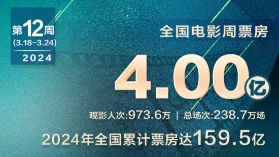 1905电影网讯 2024年第12周(3.18-3.24)全国电影周票房4亿,观影人次超973万,总场次238.7万,全年电影票房累计达159.5亿。《功夫熊猫4》首周票房破亿,获得周榜冠军。《周处除三害》位列亚军,周票房8161.6万,累计票房超6亿。《沙丘2》单周票房5508.3万,累计票房3.2亿。《灿烂的她》位列周榜第四位,累计票房超8600万。《我们一起摇太阳》点映票房收2557万,累计票房1.2亿。