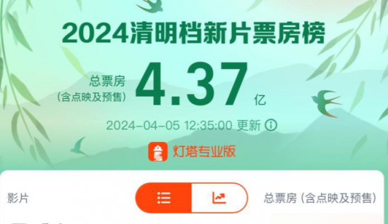 1905电影网讯 据猫眼专业版数据显示,截至,2024年4月5日12时35分,清明档新片总票房(含预售)突破4.37亿元,《你想活出怎样的人生》《草木人间》《黄雀在后!》暂列当前票房榜前三位。宫崎骏新片《你想活出怎样的人生》以3.51亿票房断层式领跑,上映首日便刷新了日本动画电影单日票房新纪录,还一举打破清明档单日票房纪录。影片不仅票房成绩亮眼,精美的画风音乐和深刻的内含隐喻,也唤起了观众满满的讨论欲。聚焦反传销题材的电影《草木人间》以超3600万的票房成绩暂居第二名。影片讲述了刚毕业的大学生何目莲(吴磊 饰)为挽救深陷传销泥潭的母亲吴苔花(蒋勤勤 饰)舍身救母的故事。冯绍峰、陶虹、黄觉主演的悬疑电影《黄雀在后!》位列第三,累计票房3175.1万元。影片围绕一桩小镇悬案展开,三个家庭牵扯其中,扑朔迷离的案情背后是底层父母为子牺牲的悲剧。电影“做不了避风港,就当垫脚石”的故事内核也引起不少家长共鸣。喜剧电影《大“反”派》收获票房1027.7万元,位居第四。《冰雪女王5:融冰之战》《雪豹》《午夜怪谈》《零度极限》分列榜单第五名至第八名。