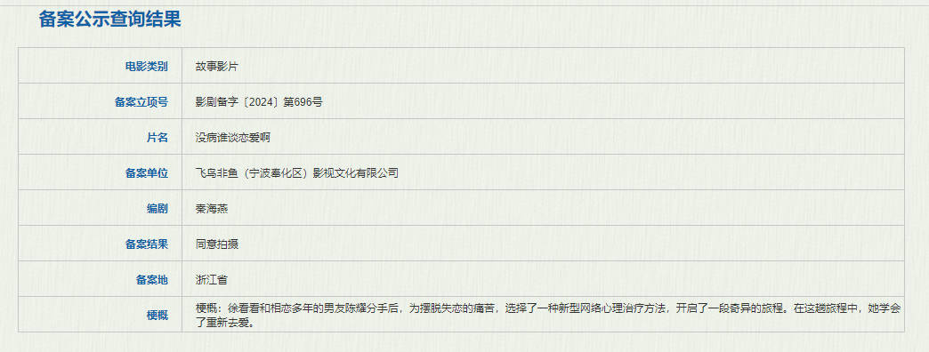 1905电影网讯 近日,国家电影局发布关于2024年3月上全国电影剧本(梗概)备案、立项公示的通知,由秦海燕(《万里归途》《刺杀小说家》)担任编剧的电影《没病谁谈恋爱啊》正式立项。根据官方发布的剧情梗概,本片讲述了徐看看和相恋多年的男友陈耀分手后,为摆脱失恋的痛苦,选择了一种新型网络心理治疗方法,开启了一段奇异的旅程。在这趟旅程中,她学会了重新去爱。