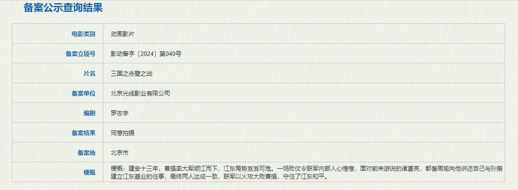 1905电影网讯 近日,国家电影局发布关于2024年3月下全国电影剧本(梗概)备案、立项公示的通知,由罗志宇担任编剧的电影《三国之赤壁之战》正式立项,备案单位显示为北京光线影业有限公司。根据官方发布的剧情梗概,本片讲述了建安十三年,曹操率大军顺江而下,江东局势岌岌可危。一场败仗令联军内部人心惶惶,面对前来游说的诸葛亮,都督周瑜向他讲述自己与孙策建立江东基业的往事,最终两人达成一致,联军以火攻大败曹操,守住了江东和平。