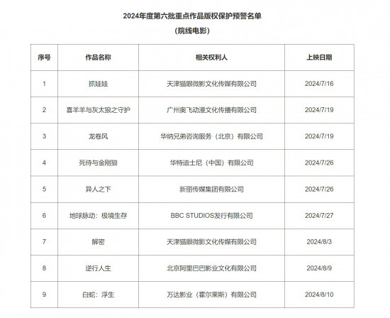 1905电影网讯 7月16日,国家版权局公布2024年度第六批重点作品版权保护预警名单(院线电影)。《抓娃娃》《喜羊羊与灰太狼之守护》《龙卷风》《死侍与金刚狼》《异人之下》《地球脉动:极境生存》《解密》《逆行人生》及《白蛇:浮生》等9部电影在列。