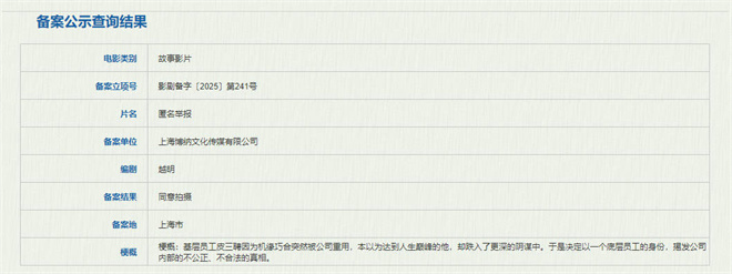 1905电影网讯 2月17日,国家电影局发布关于2025年1月上全国电影剧本(梗概)备案、立项公示的通知。由越明担任编剧的电影《匿名举报》备案立项,备案单位为上海博纳文化传媒有限公司。根据官方剧情梗概,影片讲述了基层员工皮三聘因为机缘巧合突然被公司重用,本以为达到人生巅峰的他,却跌入了更深的阴谋中。于是决定以一个底层员工的身份,揭发公司内部的不公正、不合法的真相。