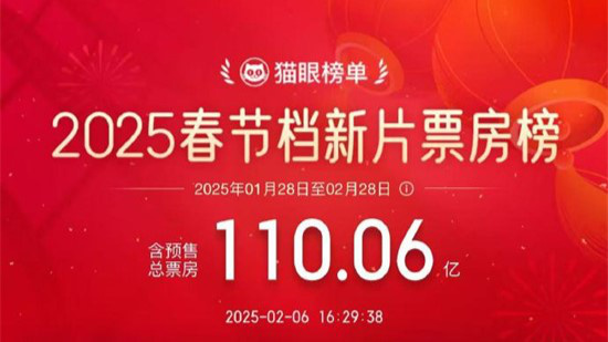 1905电影网讯 据票房平台数据显示,截至2025年2月6日16时29分,2025年春节档总票房(含点映及预售)新片总票房突破110亿元!而截至2月6日16时25分,《哪吒之魔童闹海》累计票房也超过59亿元,强势领跑!