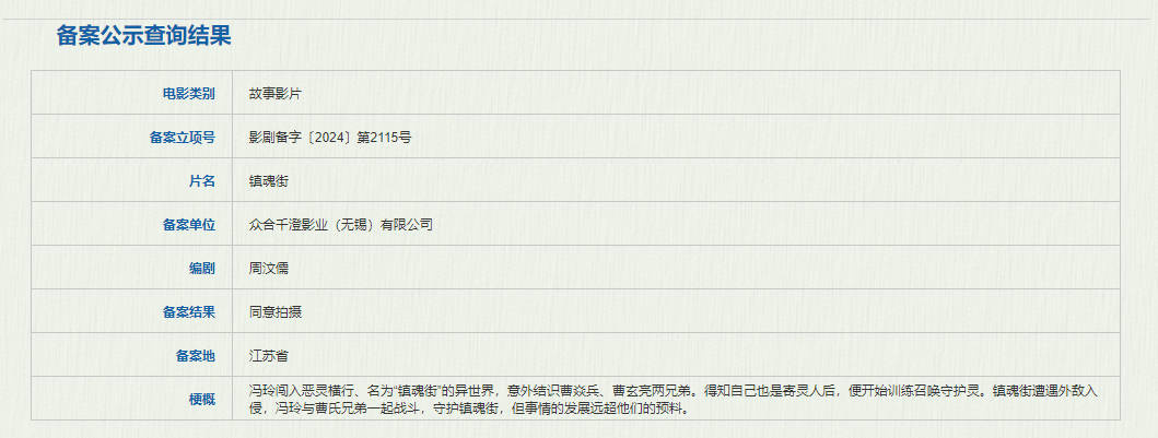 1905电影网讯 11月7日,国家电影局发布关于2024年10月上全国电影剧本(梗概)备案、立项公示的通知。由周汶儒(《第八个嫌疑人》《风林火山》)担任编剧的电影《镇魂街》备案立项。根据官方发布的剧情梗概,冯玲闯入恶灵横行、名为“镇魂街”的异世界,意外结识曹焱兵、曹玄亮两兄弟。得知自己也是寄灵人后,便开始训练召唤守护灵。镇魂街遭遇外敌入侵,冯玲与曹氏兄弟一起战斗,守护镇魂街,但事情的发展远超他们的预料。