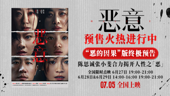 1905电影网讯 暑期档悬疑犯罪电影《恶意》发布“恶的因果”版终极预告与“凝视恶意”版终极海报,恶人全员集结,恶意喷涌而出,人性之恶轮番上演,终极大戏即将开场!