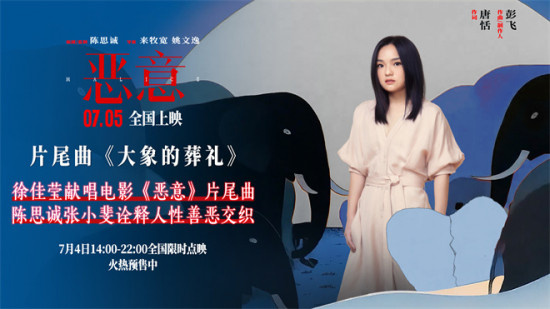电影《恶意》片尾曲《大象的葬礼》MV于近日发布。徐佳莹以她极具辨识度的轻柔嗓音,从稚趣孩童的视角解读成人世界的复杂与善变,沉重的情感却浅吟低唱,每一句困惑与疑问都别具力量、直击人心。歌曲以“大象的葬礼”隐喻向善的人性微光,在旋律中藏有对世界的温柔叩问,带我们重新听见他人心底未说出口的问候。