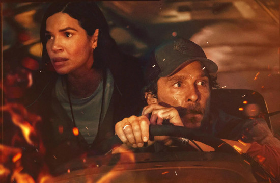 预告分别以巴士司机凯文(马修·麦康纳 饰)和老师玛丽(亚美莉卡·费雷拉 饰)的双线视角展开,最终因为这场山火命运交织在一起。而这场大火让天堂镇陷入了混乱和毁灭,凯文载着一车23名孩子做出艰难的选择。