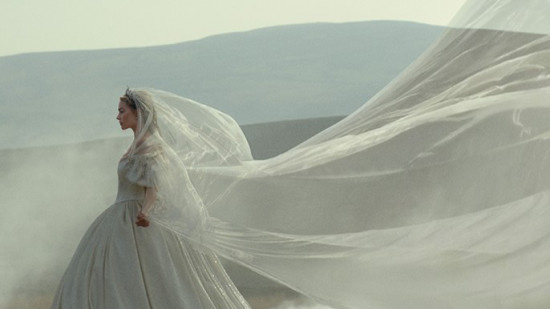 定档海报中,两位主角站在荒原之上,凯茜身着白纱,头纱随风飞扬,如一团不安的魂魄,尽显其内心的飘摇与动荡;希斯克利夫则立于虬曲的枯树下,枝桠狂乱、毫无雕饰,寓意着他粗粝狂躁的内心世界。在定档预告中,荒原的浓雾与骤雨成为这段宿命之恋的唯一见证:是雾中重逢时,那如命运召唤般的互相呼唤;亦是大雨如注的屋檐下,希斯克利夫对凯茜“吻我,让我们一起沉沦”的低语。荒原上纵然云遮雾罩,枯株朽木,但两人间的爱与恨却如荆棘缠绕,生生不息。
