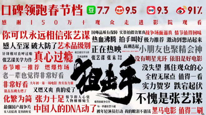 张艺谋首次进军春节档集结金牌班底,电影《狙击手》深显导演功力也获得影迷一致好评。在影片制作过程中,导演张艺谋坚持全实景拍摄“等不到雪就不能拍”,在吉林白山零下三十几度的低温中,完成全冰雪战场场景的还原。在影片短小精悍的96分钟里,以小切口展现伟大的抗美援朝精神,凝练了一场干净利落的阵地狙击战,刻画了在这场残酷战争中发挥重要作用但总是躲在角落中的一群无名英雄,但在克制中却迸发出浓厚的情感力量。